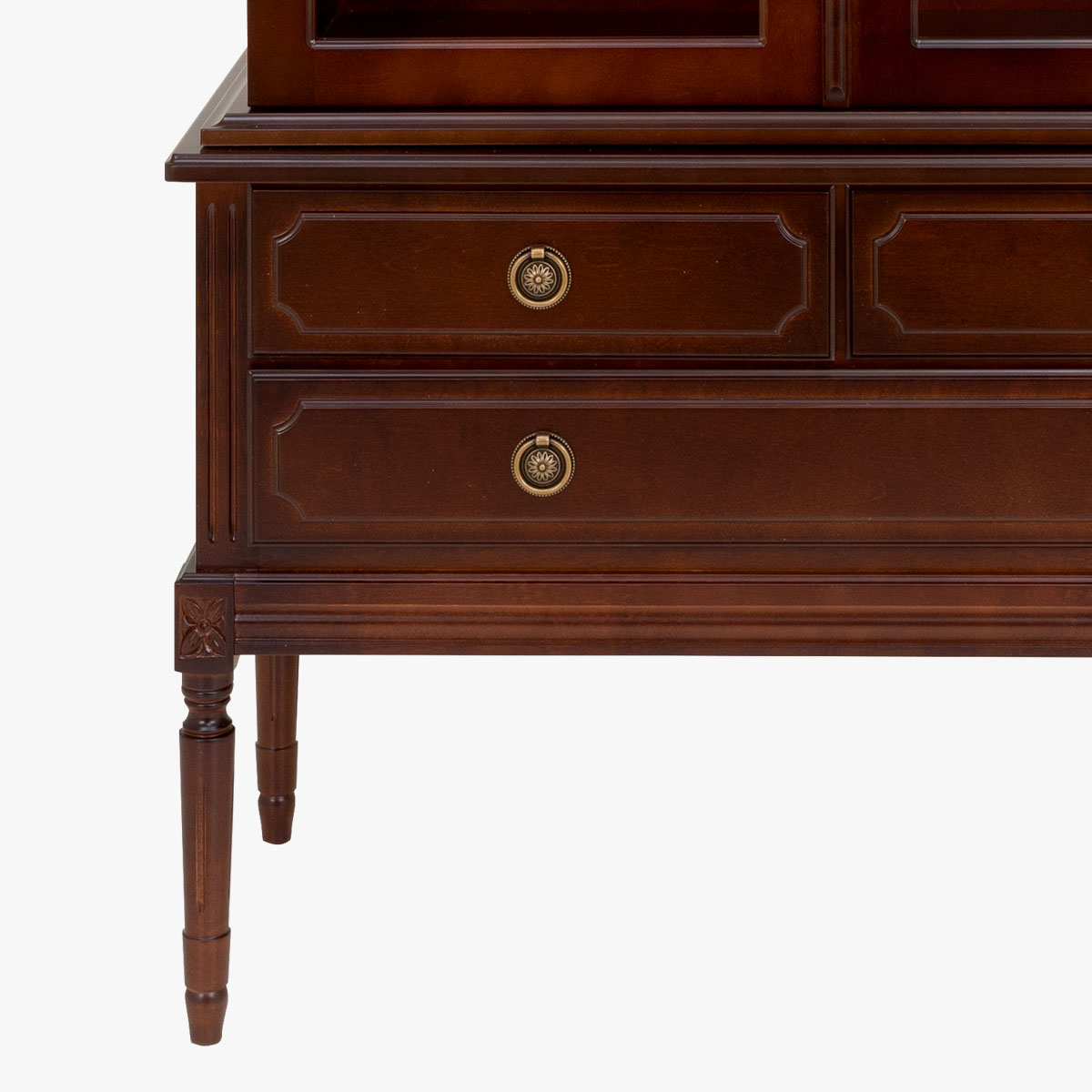 Empiretyylinen hopeakaappi/vitriinikaappi, jonka yläosassa on lasiovellinen kaappi ja alaosassa vetolaatikot.