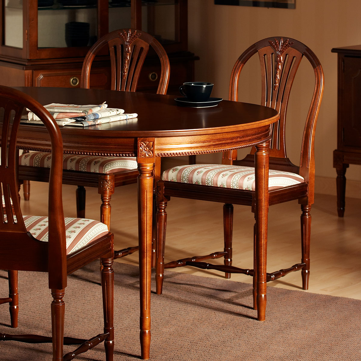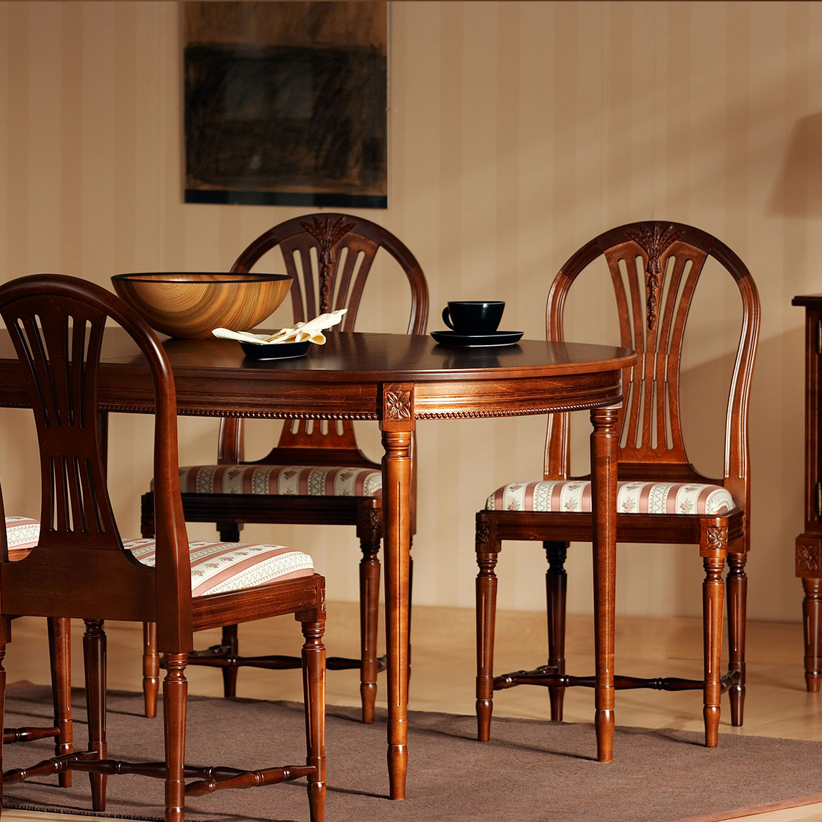 Yhdistä ruokapöytä Tähkäempire- tai Hepplewhite-tuolien kanssa. Empiretyylinen ruokapöytämme soveltuu yhdistettäväksi myös kustavilaistyylisten tuolien kanssa.
