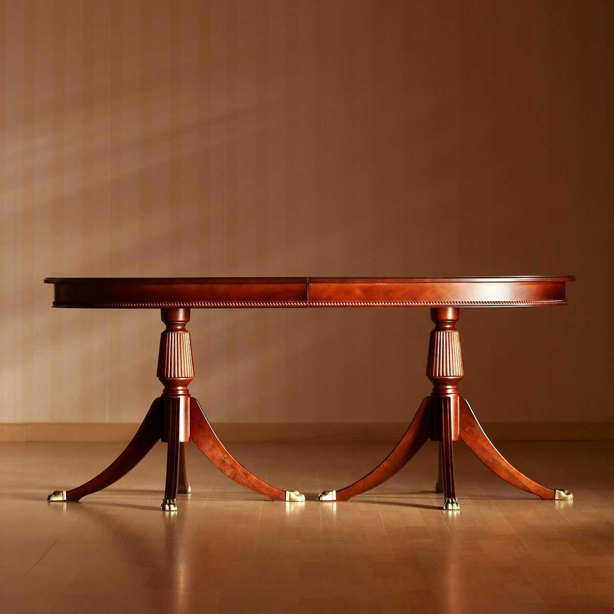 Hepplewhite ruokapöytä on empiretyylinen ovaalin muotoinen jatkettava ruokapöytä, jossa on kaksi pylväsjalkaa. Pöytä soveltuu 6 hengelle, mutta jatkettuna jopa 8-10 hengelle.