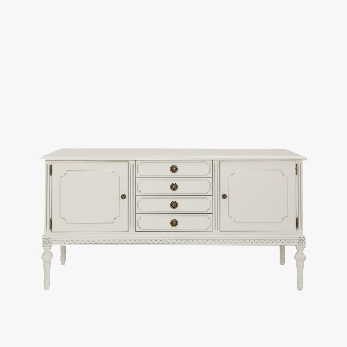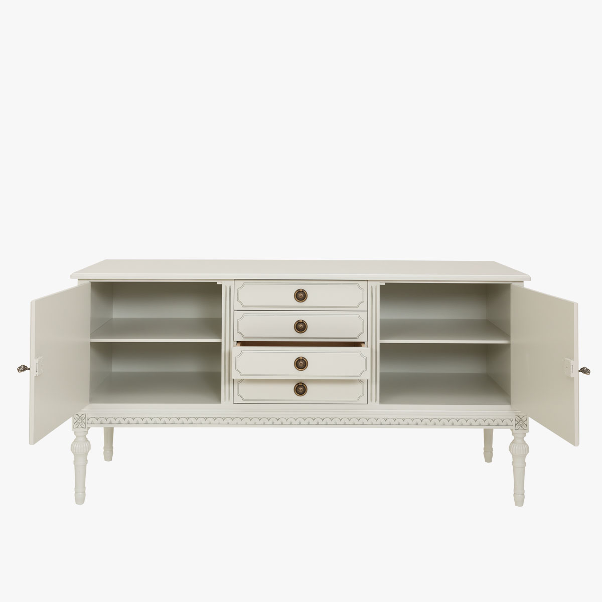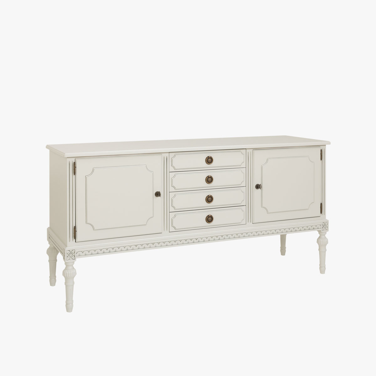 Kustavilainen matala astiakaappi, jota voisi kutsua myös senkiksi. Astiakaapissa on säilytystilaa kahden kaapin ja neljän laatikon verran. Tämän kustavilaistyylisen säilytyskalusteen kansi toimii työtasona tai laskutilana.