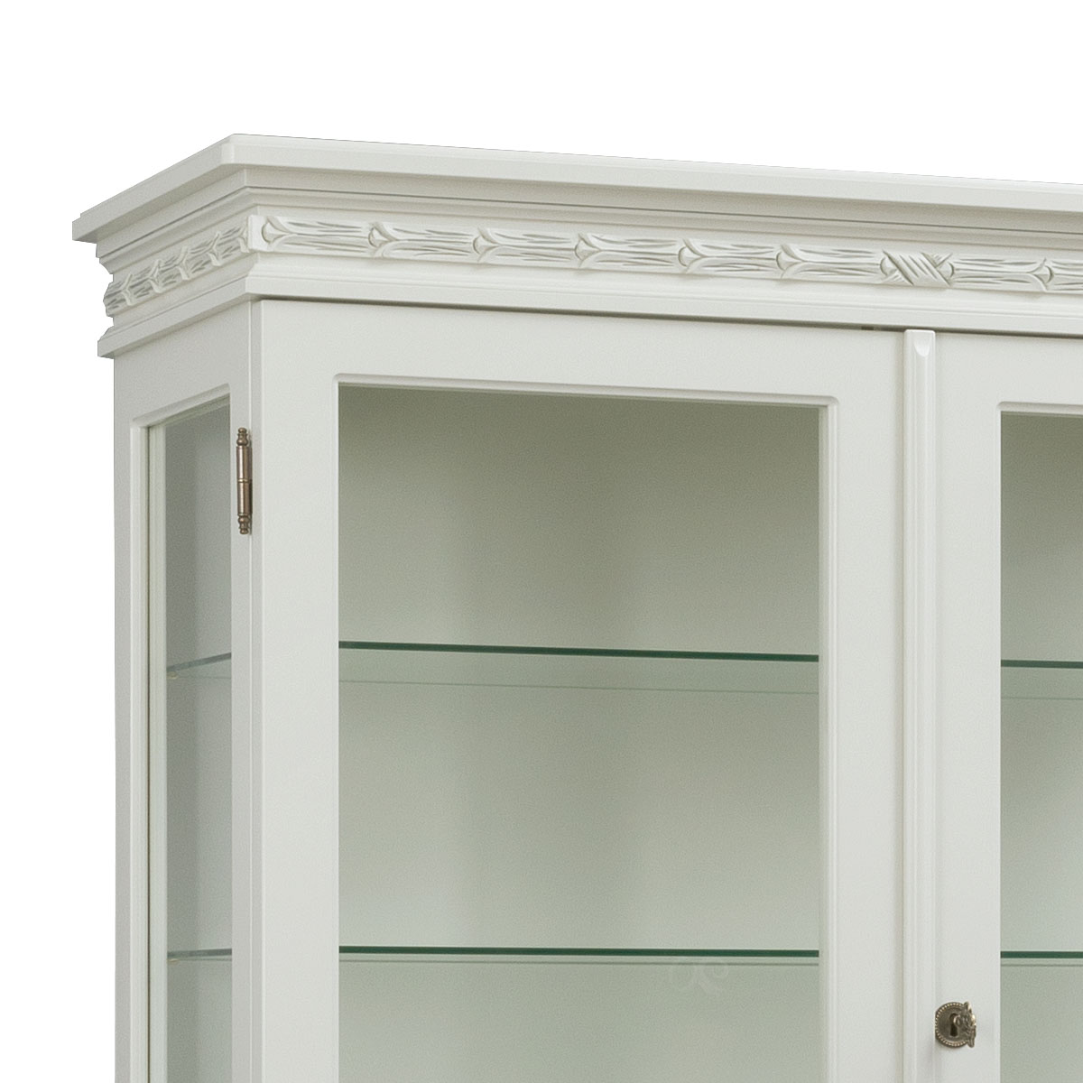 Yläosan ovissa ja sivuseinillä ovat lasit, jotka keventävät kalusteen ilmettä sekä säilyttävät tilan tuntua huoneessa, johon se on sijoitettu. Kaapin saranat, lukot ja avaimet ovat antiikkipatinoidut, pohjaväriltään messingin väriset.