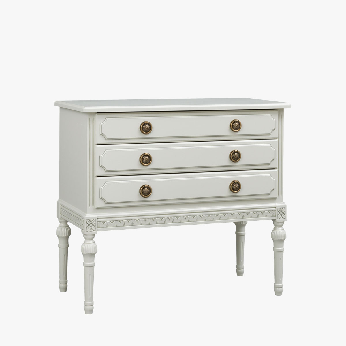 Kustavilainen lipasto 80 cm on leveämpi kustavilaistyylinen lipastomme, jossa on säilytystilaa kolmen vetolaatikon verran. Saatavilla useita värejä.