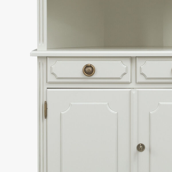 Kaapin yläosassa on lasiovet, joiden takaa löytyy säädettävä hyllylevy. Alla on taso, pienet laatikot ja kaksiovinen kaappi. Yläosan koristelistaa kiertää ornamenttikuvio. Nurkkakaapissa on kolme jalkaa. Laatikoissa on kustavilaistyyliset, antiikkipatinoidut rengasvetimet. Ylä- ja alakaappien ovet ovat lukittavat.