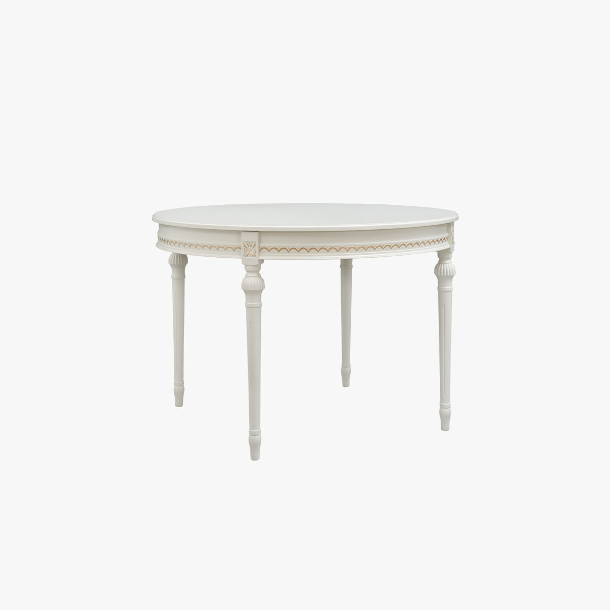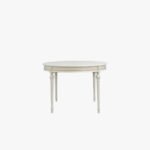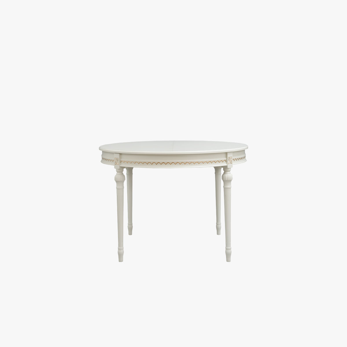 Kustavilaistyylinen pyöreä ruokapöytä, jossa on mekanismilla toimiva jatkolevy. Soveltuu parhaiten 2-4 henkilölle.