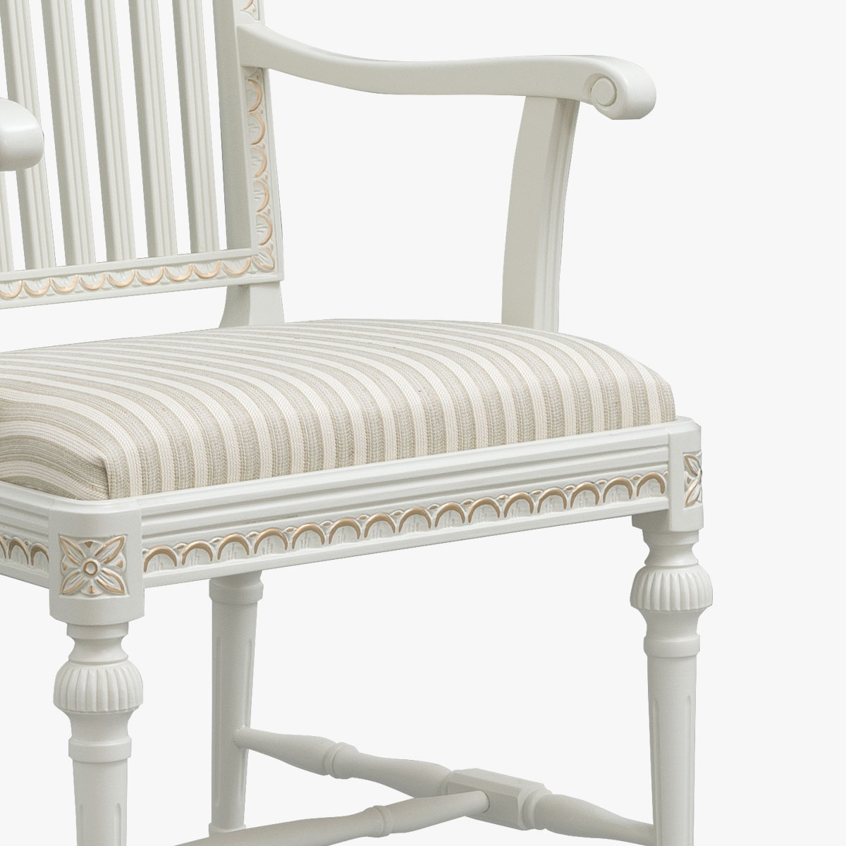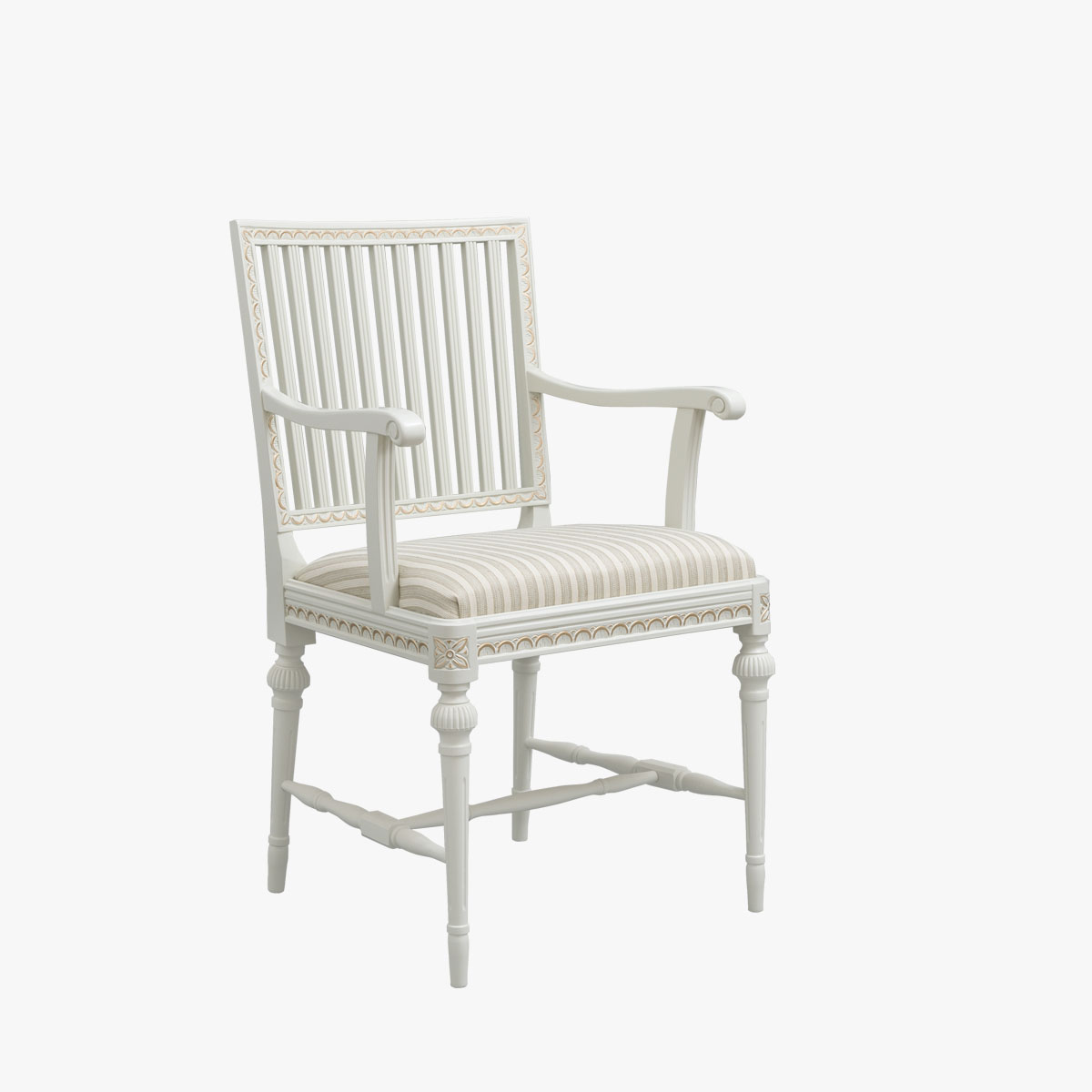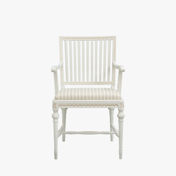 Sijoita kustavilainen nojatuoli kodin olohuoneeseen, huvilan salonkiin tai vaikka kartanon kokoustilaan. Tuoli toimii yksittäisenä koristeellisena sisustuselementtinä ja istumapaikkana, mutta luodaksesi suuremman istuinryhmän, voit yhdistää pari nojatuolia kustavilaisen sohvapöydän sekä sohvan kanssa.