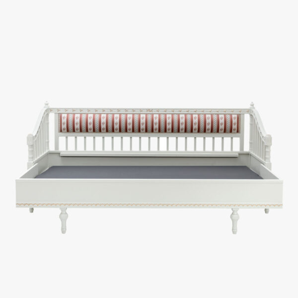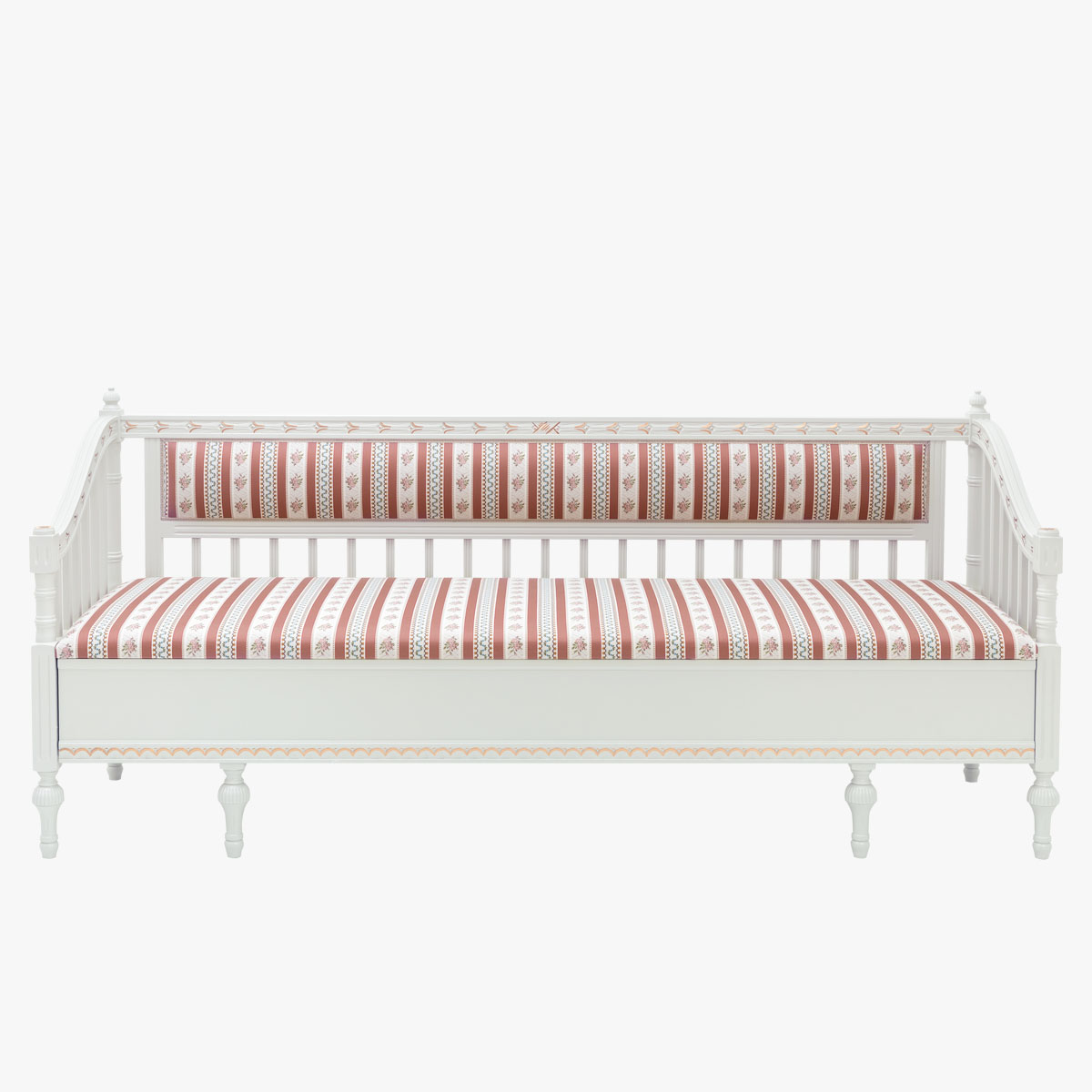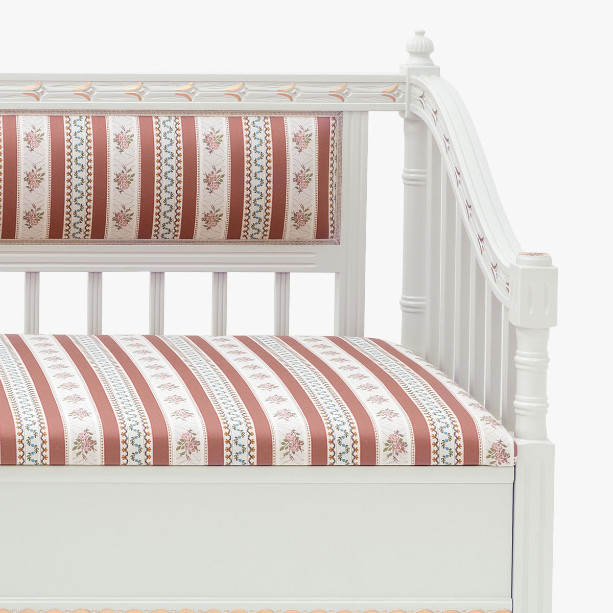 Kustavilaisessa sohvasängyssä on pehmustettu istuinosa sekä selkänoja, joissa on kiinteä verhoilu.
