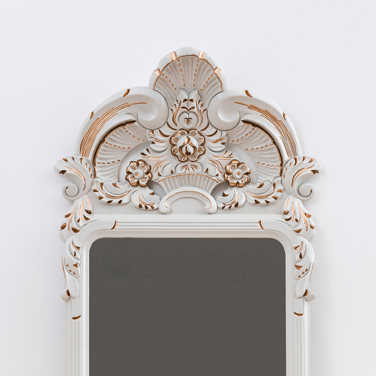 Seinälle ripustettavan talonpoikaisrokokoo peilin koristeellisissa puukehyksissä on upeat, käsin veistetyt yksityiskohdat. Peilin koristeaiheina ovat ruusut, lehtiornamentit sekä simpukkaa muistuttava rocaille-kuvio.