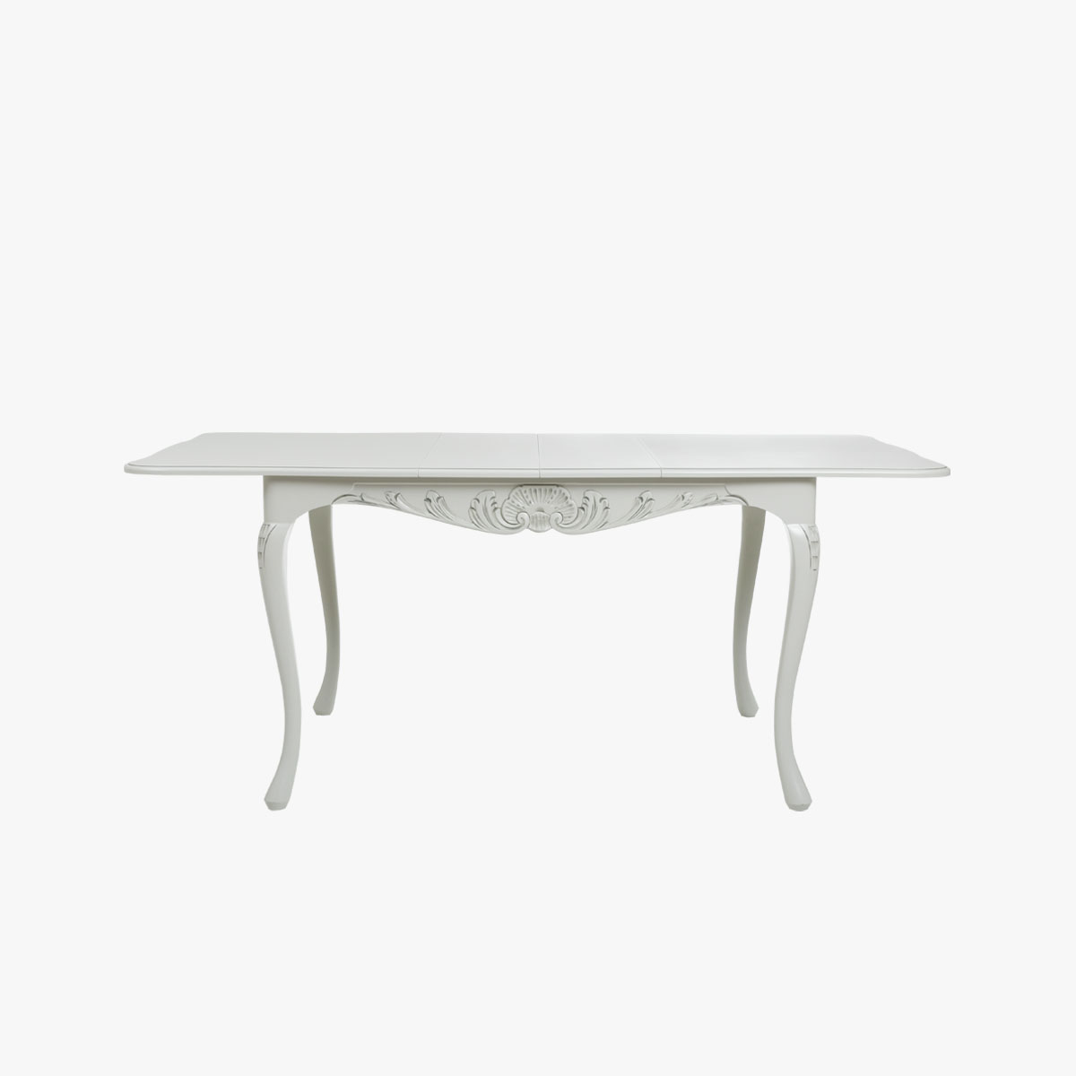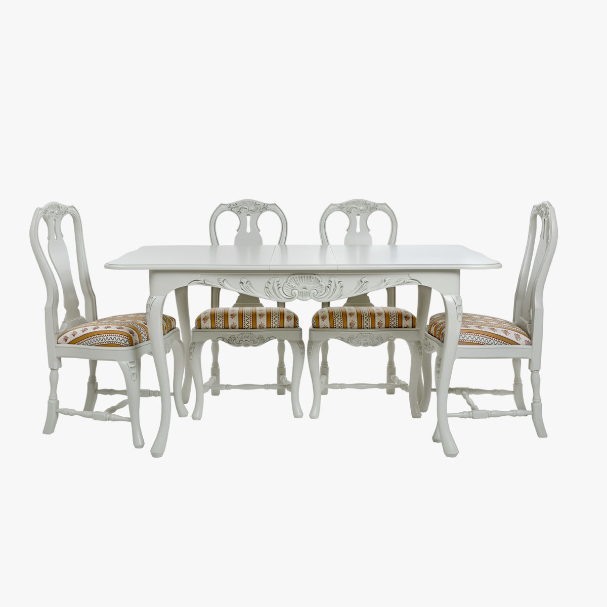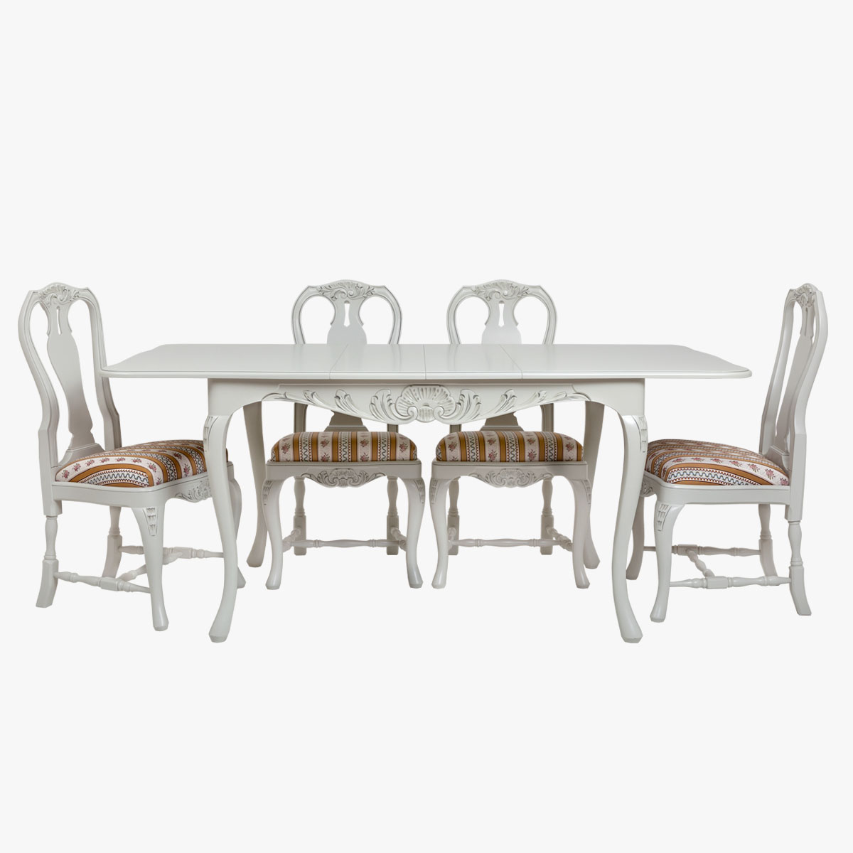 Talonpoikaisrokokootyylinen, suorakaiteen muotoinen jatkettava ruokapöytä, joka soveltuu parhaiten 4 hengelle, mutta jatkopaloilla pöydän ympärille mahtuu 6 henkeä.