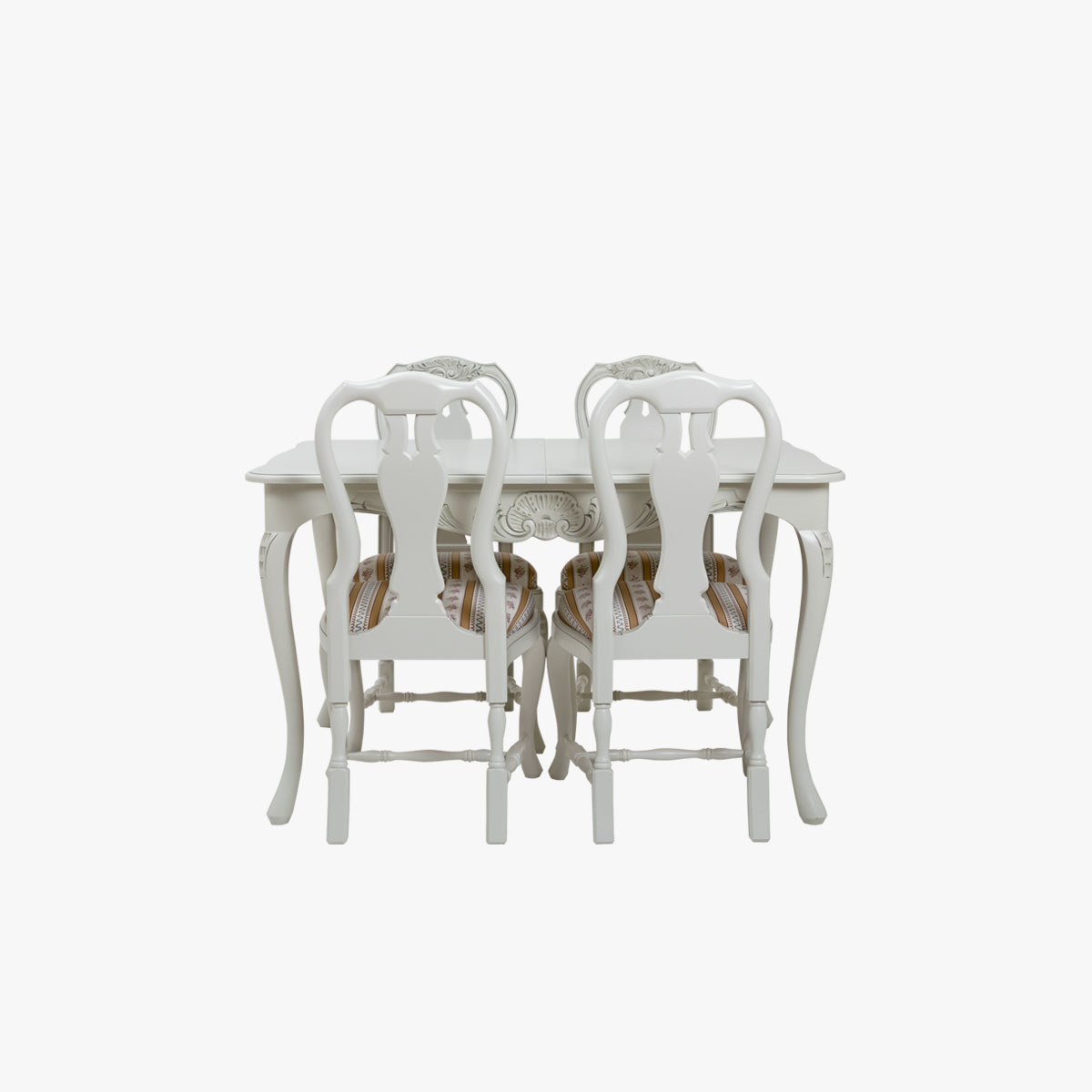 Valitse tämän pöydän kanssa talonpoikaisrokokoo tuolit ja luo ruokaryhmästä yhtenäinen kokonaisuus, jota yhdistävät samat värit ja kuvioaiheet.