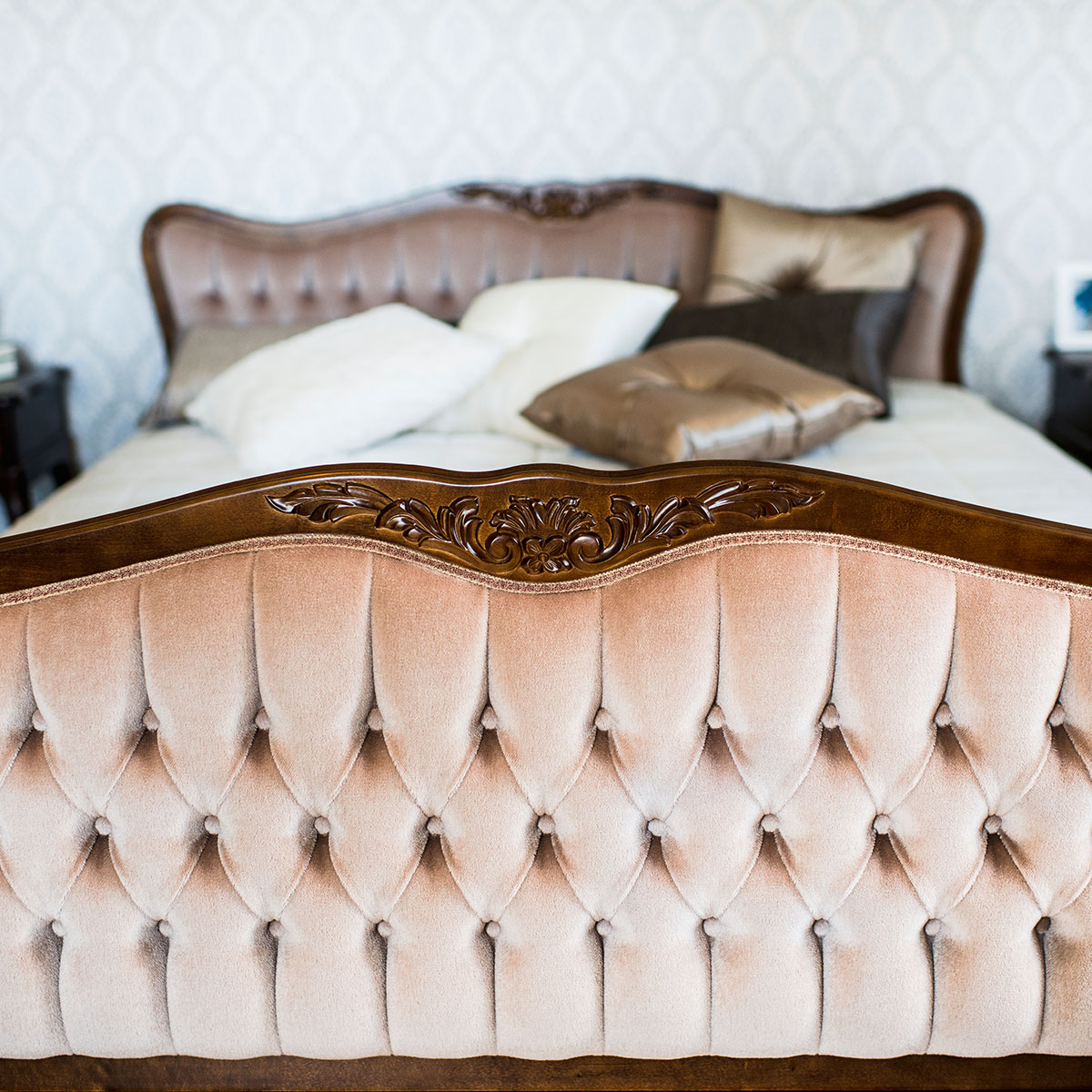 Ylellinen talonpoikaisrokokoo sänky, jossa on mohair-kankaalla verhoillut päädyt. Verhoiltu parisänky on saatavilla sekä 160 cm leveänä että 180 cm leveänä.