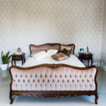 Ylellinen talonpoikaisrokokoo sänky, jossa on mohair-kankaalla verhoillut päädyt.