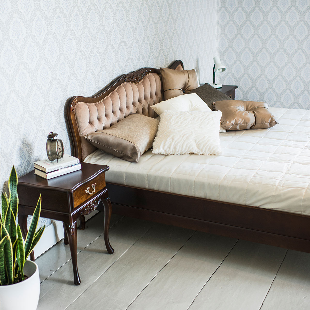 Ylellinen talonpoikaisrokokoo sänky, jossa on mohair-kankaalla verhoillut päädyt. Verhoiltu parisänky on saatavilla sekä 160 cm leveänä että 180 cm leveänä.